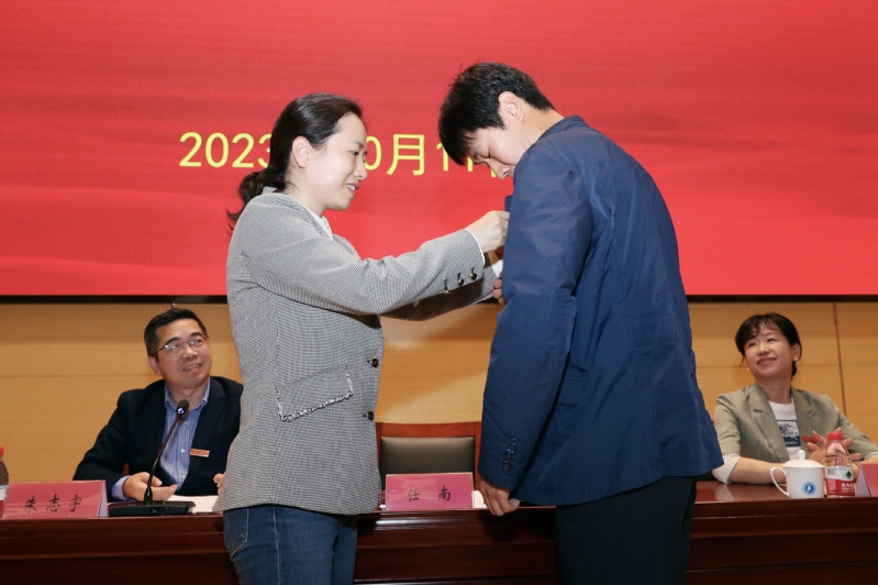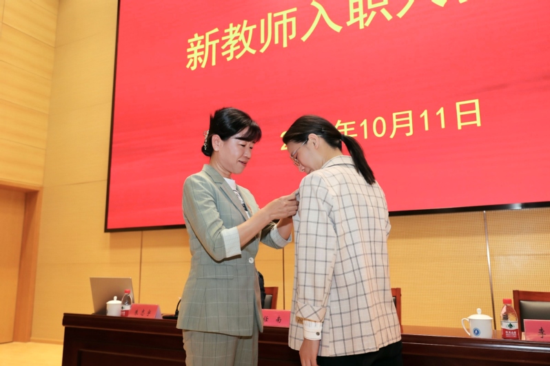 接下来举行新教师入职入会仪式,由任南副校长为新教师代表边昂博士颁发校徽。校工会常务副主席李明睿为新教师代表侯秋林博士颁发工会会徽。
