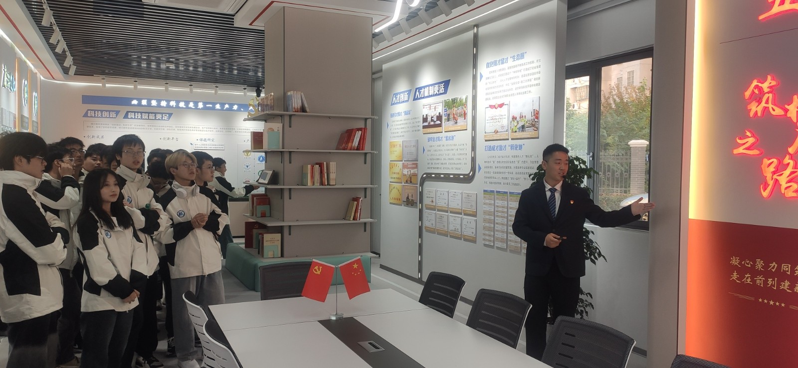 江苏镇江路桥工程有限公司董事长严承俊、党委副书记陈敏敏、党群工作部部长陶明等对学院一行的来访表示热烈欢迎。党委副书记陈敏敏带领师生参观了公司的党建文化展厅,为师生们详细介绍了公司的基本情况、发展历程以及辉煌成就。李红明书记介绍了学院党建工作以及近几年取得的工作成效,详细介绍了茅以升阵地的建设情况,提出希望能加强与企业的合作,发挥各方优势,共同传承好镇江地域红色文化。