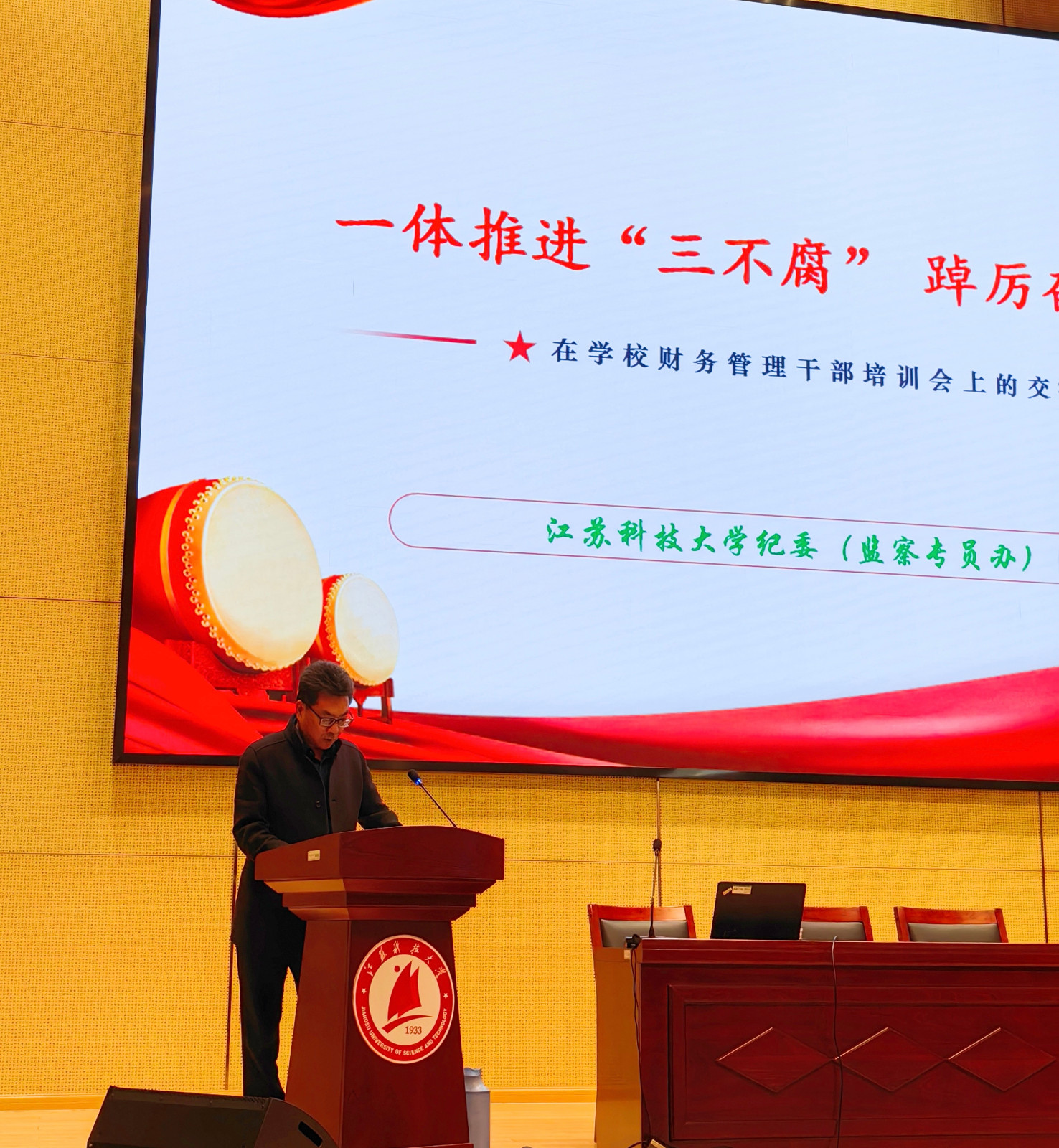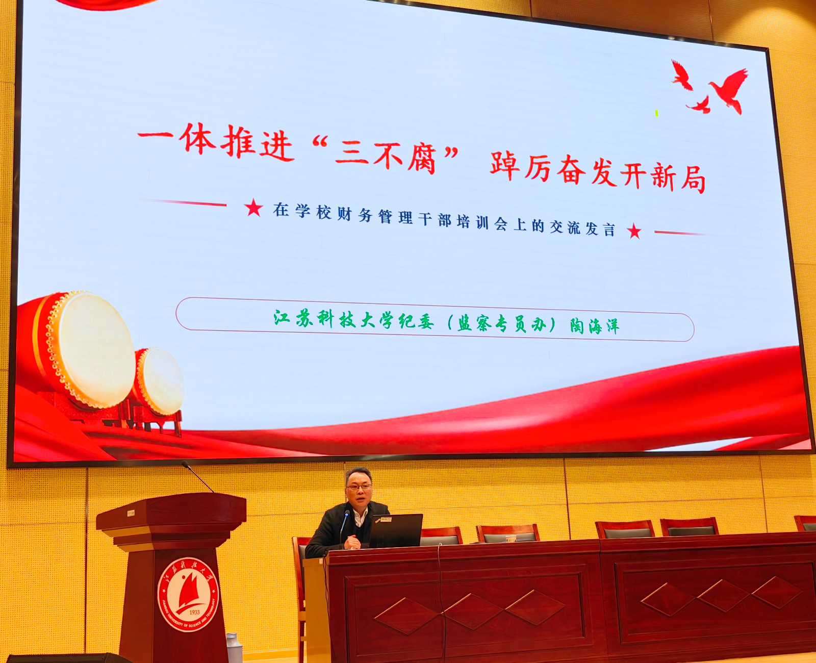 为进一步加强学校全面从严治党和党风廉政建设工作,落实从严管党治党各项要求,特别是加强财务领域党风廉政教育工作。财务处于 2023年11月20日下午,在行政楼100号,召开财务领域党风廉政教育专题培训。此次培训特邀请校纪委副书记陶海洋同志送纪上门,为全体财务人员作“一体推进‘三不腐’ 、踔厉奋发开新局”的主题报告。参加本次廉政教育专题培训的有校财务处、后勤集团财务部、资产公司财务部、张家港校区财务处全体人员,特别邀请总师办招标办、安保处和审计处同仁参加。