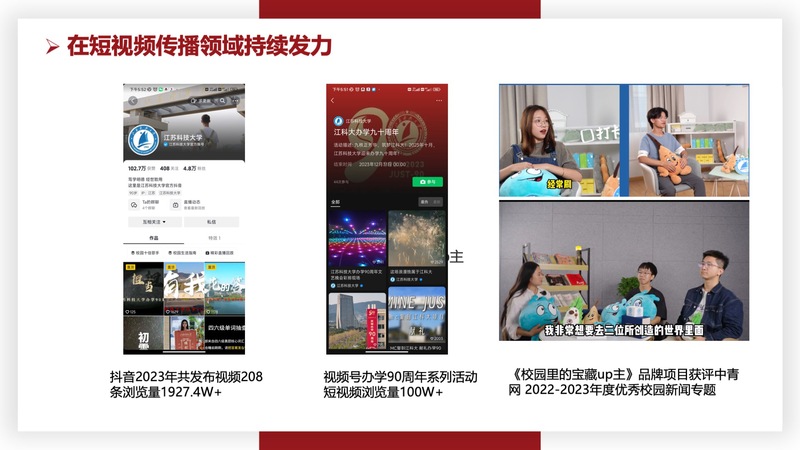 作为校园官方新媒体平台之一,米兰网页版页面登录官方视频号于2021年11月开通,由党委宣传部融媒体中心负责运营管理。截至目前,共发布短视频作品279条,总浏览量320万余次,点赞量15万余次,转发量5万余次。视频号内容被中国大学生在线、学习强国平台、中国青年报、中青校媒等组织、媒体和机构转发引用。