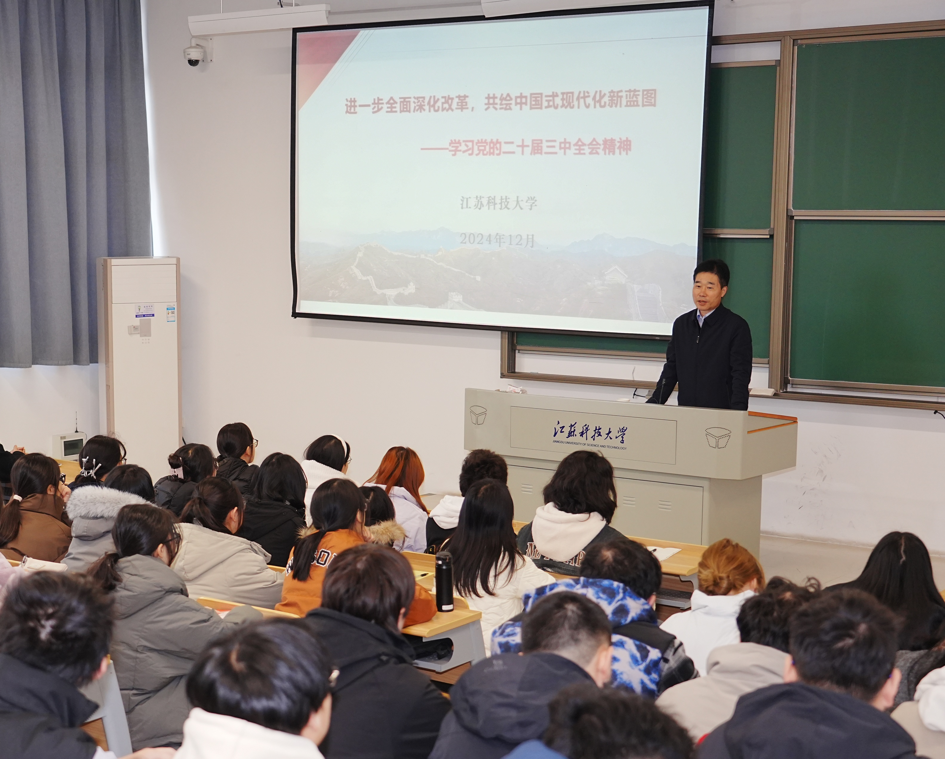 校党委书记杨建新以《进一步全面深化改革,共绘中国式现代化新蓝图》为题,用生动的语言、详实的数据、鲜活的案例,对党的二十届三中全会精神进行系统深入的阐释。在座师生们专注聆听,纷纷表示,杨书记的思政课既有理论高度,又有实践深度,“干货”十足,令人备受鼓舞。
