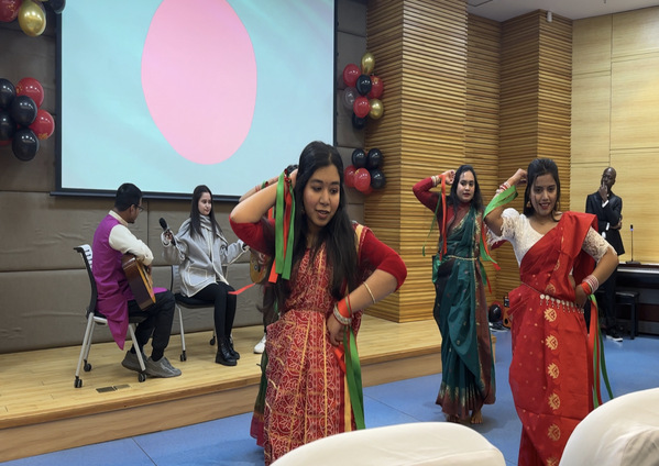 大会最后阶段,中外学生联袂同台献艺,为师生带来一场跨文化交流的视听盛宴。来自船舶与海洋工程学院的陈沛实和来自经济管理学院的万欣妍,分别献唱《落叶归根》《漂洋过海来看你》,赢得阵阵掌声;留学生阿代、景林等则以动感十足的freestyle舞蹈,展示了非洲文化的独特魅力;Charuaka、Tanaka等以乐队形式表演了英文歌曲串烧,现代感十足;丽娜、孔彭等用中文朗诵了著名诗篇《沁园春·雪》,令人心潮澎湃;孟加拉国的留学生带来的民族舞蹈《KOMOLA》,更是将活动推向了最高潮。