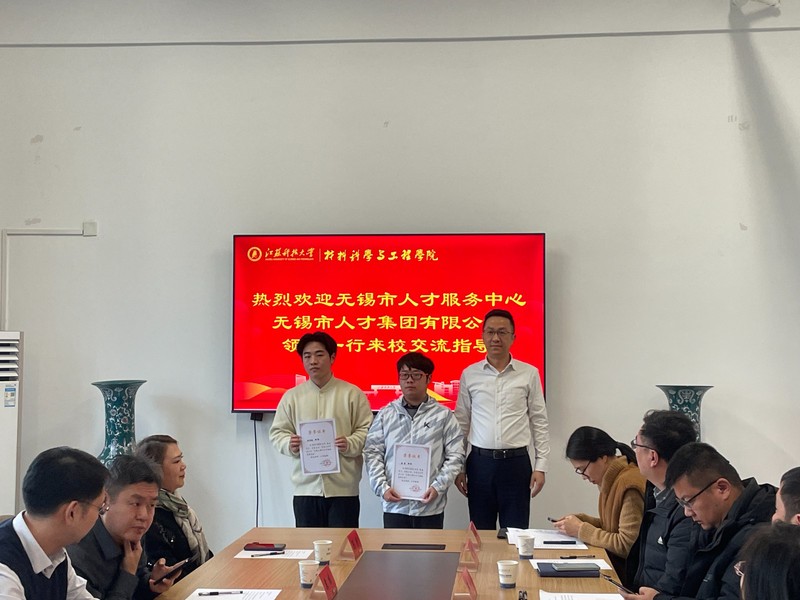 为深入推进校地校企合作,鼓励优秀大学生前往无锡就业安家,1月8日,“无锡太湖人才卓越锻造奖学金”颁奖仪式在材料学院518会议室举行。无锡市人才服务中心党委书记、主任陈曦,服务部部长袁栋,无锡市人才集团有限公司副总经理许铮,人才服务事业部总监陈赟、副总监秦乔,校学生处副处长杨亚洲、教育发展基金会副秘书长李洋,材料学院党委书记李瑞峰、副书记杨海涛、材料成型系副主任臧千昊、团委书记张正栋出席颁奖仪式。材料成型专业各年级辅导员、获奖学生代表参加。仪式由杨海涛主持。