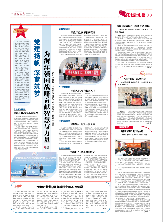 该党支部以“船魂”精神——“江海襟怀、同舟共济、扬帆致远”为引领,始终坚守兴海报国、向海图强的历史使命,聚焦海洋强国战略,以“党建红”引领“深海蓝”为核心,积极实践“多维融入、多项服务”的工作机制,创建“深蓝红心”党建品牌,培育兴海报国行业精英,解决关键技术难题的创新实力再提升、科技成果转化服务社会全链条打通、专业学科建设实现新突破,奋力推进学校高质量发展,为海洋强国建设作出了江米兰网页版页面登录人的贡献。