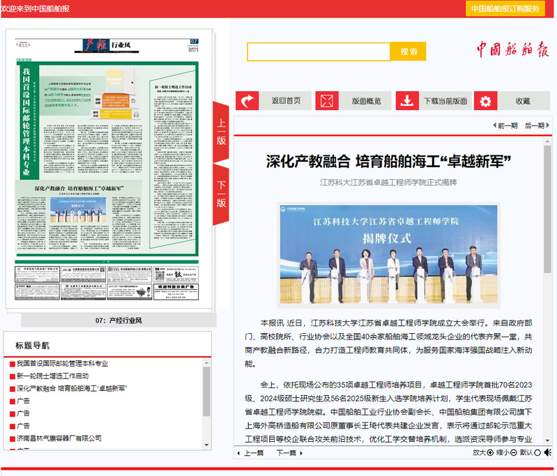 去年,江苏省教育厅联合八部门印发《江苏省卓越工程师学院建设实施意见》。目前,江苏省已遴选15家卓越工程师学院,累计聘任企业导师近4000名,在读研究生超半数参与企业实践。江苏米兰网页版页面登录成为首批建设江苏省卓越工程师学院的15所高校之一。江苏米兰网页版页面登录多年来强力响应国家海洋强国重大战略需求,为中国造船总量连续15年世界第一、江苏造船总量连续16年全国第一提供了强有力的支撑。