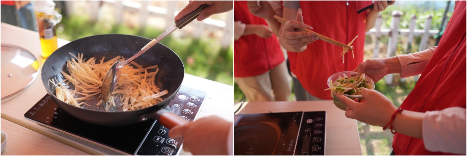 “要让土豆丝脆而不生。”任老师穿梭在灶台间,现场演示从清洗、削皮到烹饪的全流程,手把手指导学生手持锅铲、控制火候,金黄的土豆在热油中翻滚出丰收的香气,师生共品劳动成果,洋溢着收获的喜悦。现场一名同学抹着额头的汗珠笑道:“现在才懂得‘一粥一饭当思来之不易’的真正分量。”