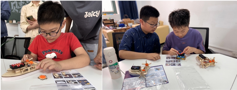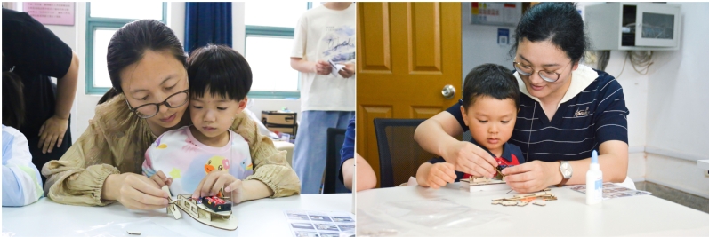 巧手造舟,匠心育人,亲子协作实践体验。造船实践环节中,贝壳学堂助教为每位小朋友准备了材料包,包含桐木片、电机、信号接收器等部件。在造船过程中,大学生讲师团队穿梭其间耐心解答每一个问题,在动手实践中体验到了无尽的乐趣,提高了青少年对船舶科学探索的浓厚兴趣。