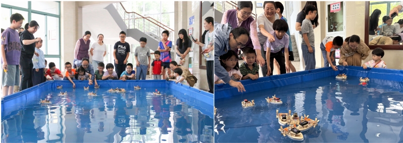 百舸争流展风采,奋楫争先向深蓝。课堂最后,小朋友们来到水池旁边进行试水航行,15艘船模整齐排列,蓄势待发。这场别开生面的船模竞赛,不仅让孩子们体验到船舶的魅力,更在亲子互动中播撒了海洋梦想的种子。