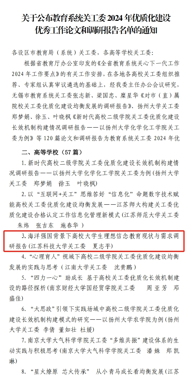 近日,江苏省教育系统关心下一代工作委员会公布了2024年优质化建设优秀调研报告名单,我校船舶与海洋工程学院关工委报送的《海洋强国背景下高校大学生理想信念教育现状与需求调研报告》获评优秀调研报告。