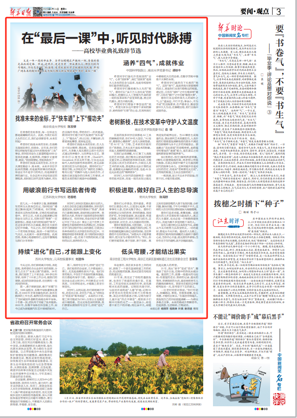 前几天,一个身着学士服、骑着脚踏车的男生从我身边经过,当时校园广播里正飘来《起风了》的歌词。你们明媚、青涩而又热忱的形象,定格在校园的画卷中。多年以后,大家未必能清晰记得毕业论文的正文,但附页的“致谢”一定刻骨铭心,那是大家写给校园的“情书”,在这里求学的点点滴滴,都会在大家的记忆中珍藏。今天之后,你们将要删除一个常用收货地址,取消一个城市的天气关注,从此展开一段新的旅程。此刻告别,我真心地感谢你们,这些年慷慨地与我们分享青春!