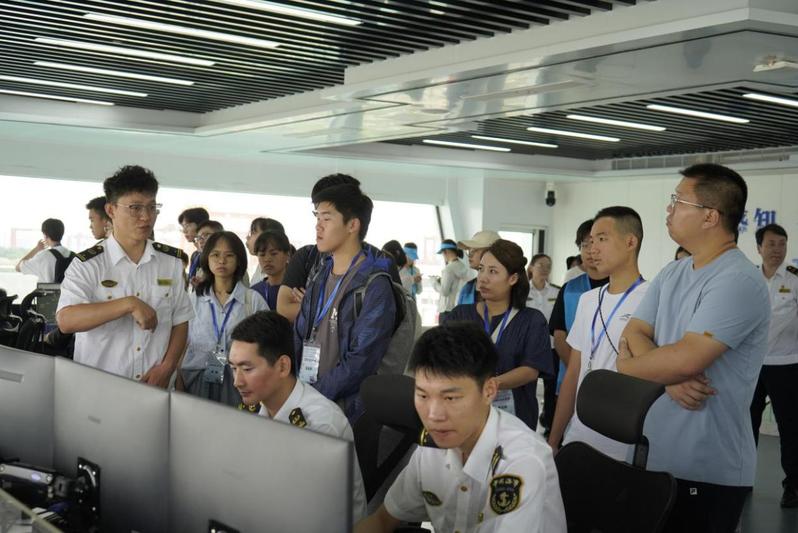 营员们登上“海巡0639”艇,驶向融合多种前沿功能的水上绿色服务区,亲身体验“一次靠泊、多项服务” 模式为船员工作与生活带来的极大便利,深刻认识水上交通精细化管理与绿色航运发展的重要意义。他们还前往六圩河口快反处置中心,现场观摩精彩的海事应急处置演练,直观感受高新技术在海事动态监管、应急救援等方面的高效应用。先进的设备、专业的操作不仅展现了长江镇江段综合治理的现代化水平,也激发了青年学子对海洋与航运事业的浓厚兴趣。