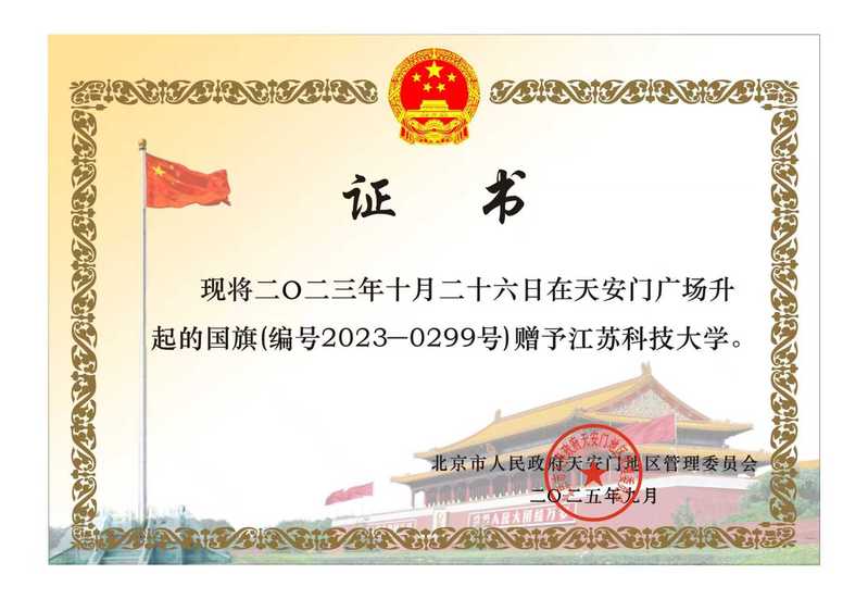 赠旗仪式庄严隆重。北京市人民政府天安门地区管理委员会党组成员、副主任姚辉与校党委常委、副校长潘锦全代表双方签订《国旗赠予协议》。姚辉向学校赠送国旗,就国旗保管使用提出相关工作要求。潘锦全代表学校接收国旗,向天安门地区管委会表示感谢,介绍了学校基本情况及国旗展陈和使用计划,并表示,学校将持续发挥受赠国旗在爱国主义教育方面的特殊载体功能,激励全体师生铭记红色历史、矢志兴船报国。校党委常委、宣传部部长周春燕,学生工作处处长朱金一同见证这一荣耀时刻。