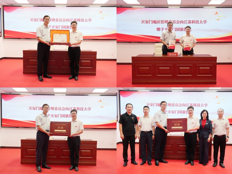 赠旗仪式庄严隆重。北京市人民政府天安门地区管理委员会党组成员、副主任姚辉与校党委常委、副校长潘锦全代表双方签订《国旗赠予协议》。姚辉向学校赠送国旗,就国旗保管使用提出相关工作要求。潘锦全代表学校接收国旗,向天安门地区管委会表示感谢,介绍了学校基本情况及国旗展陈和使用计划,并表示,学校将持续发挥受赠国旗在爱国主义教育方面的特殊载体功能,激励全体师生铭记红色历史、矢志兴船报国。校党委常委、宣传部部长周春燕,学生工作处处长朱金一同见证这一荣耀时刻。